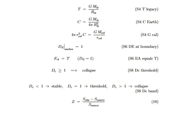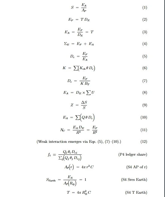 This page is the current working equation inventory. It is written to be readable even if you do not render LaTeX on the website. For each entry, I keep the Label and Tag, then I give the LaTeX form (the PDF notation), and then a plain-text form (web-safe, easy to scan and easy to quote).